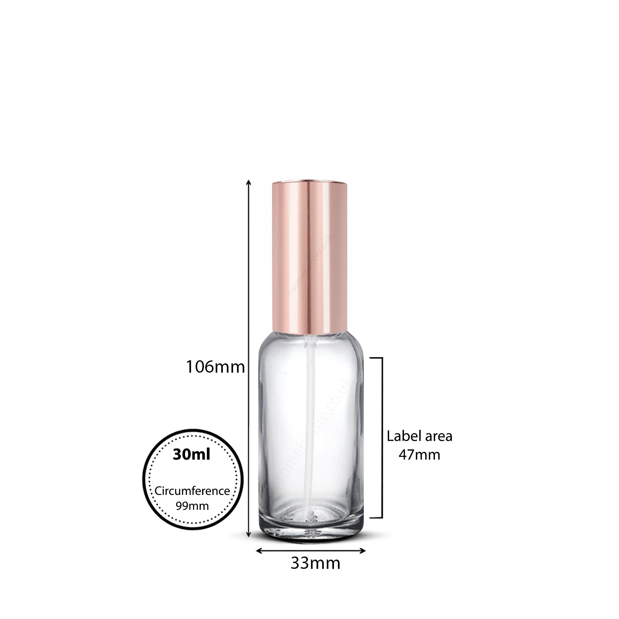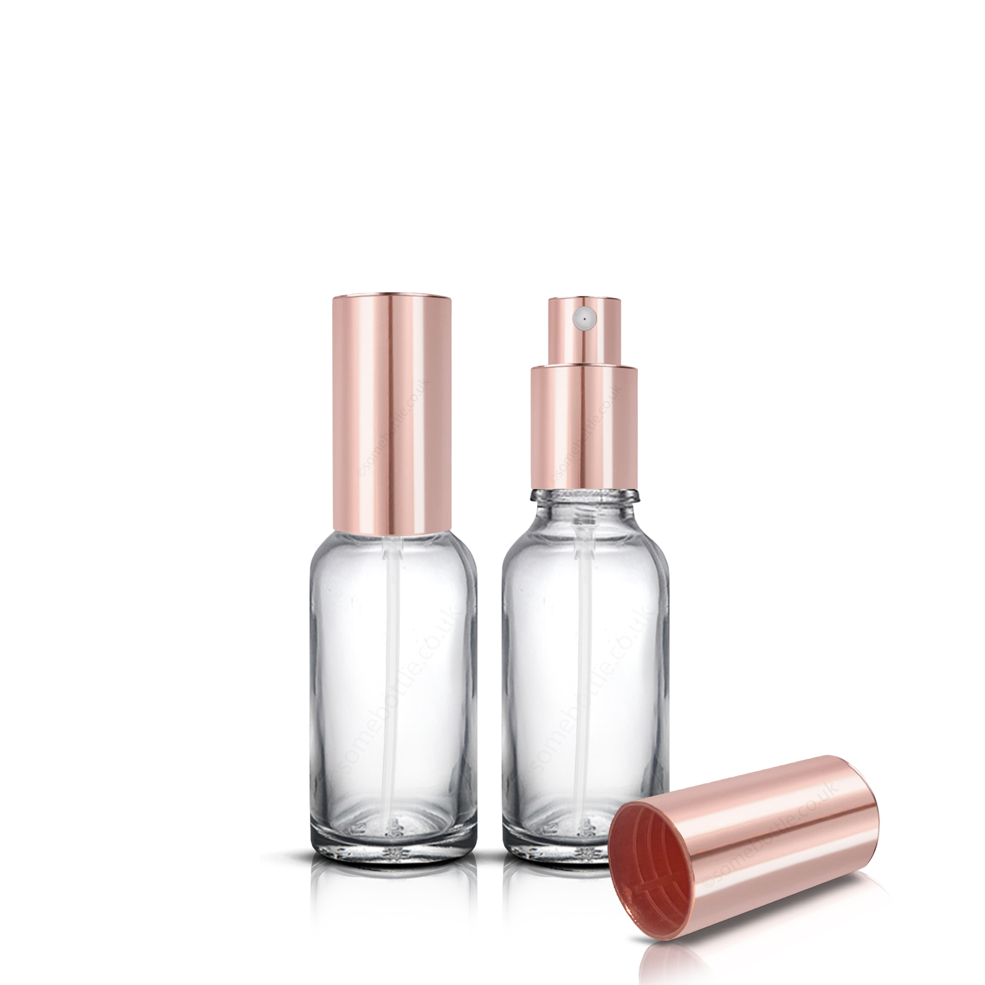 30ml Clear Glass Spray Bottle With Rose Gold Aluminium Fine Mist Sprayer Atomiser Pump and Matching Over-cap