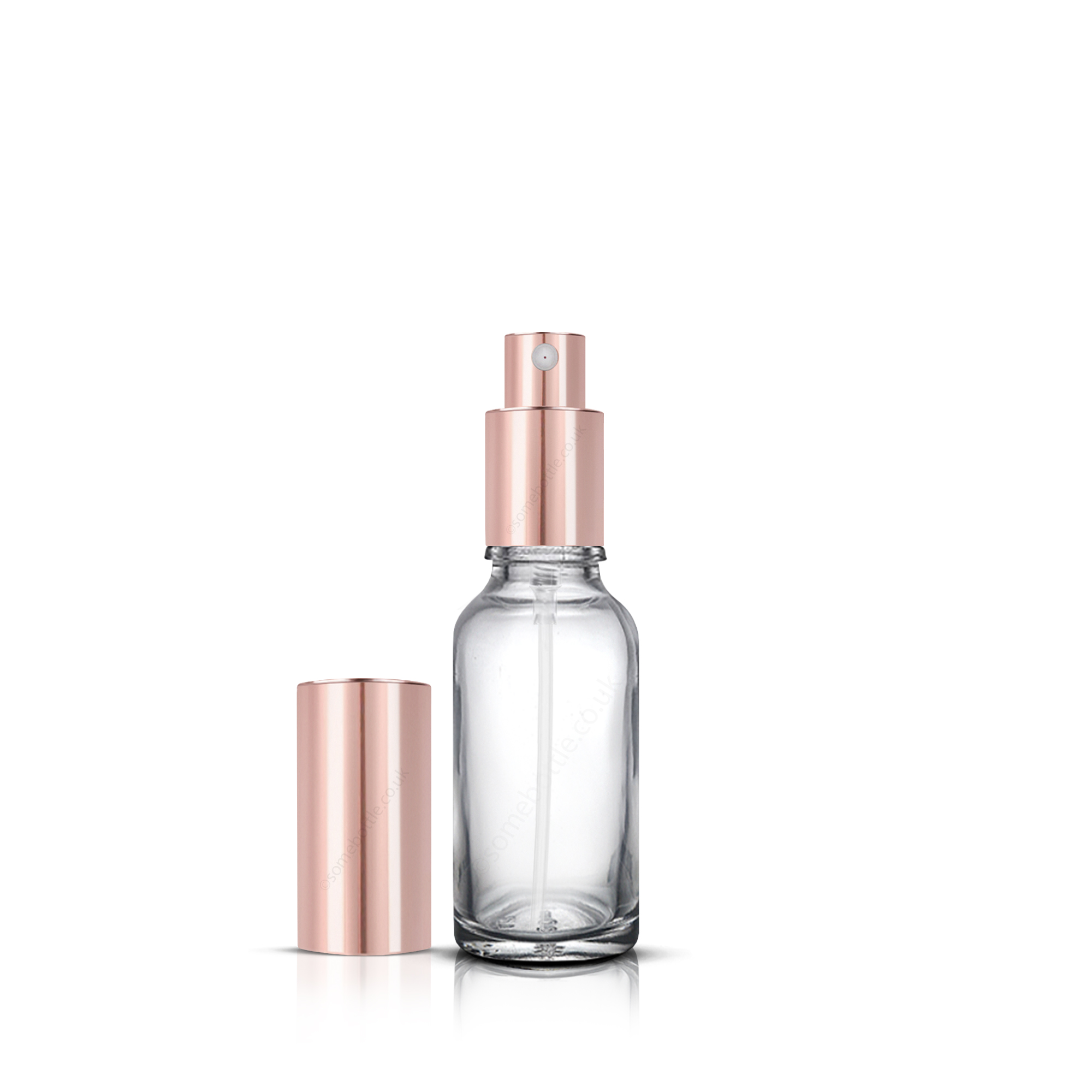 Protect, store and accurately dispense your liquid products with this eco friendly 30ml clear glass spray bottle with aluminium rose gold coloured mist sprayer atomiser.