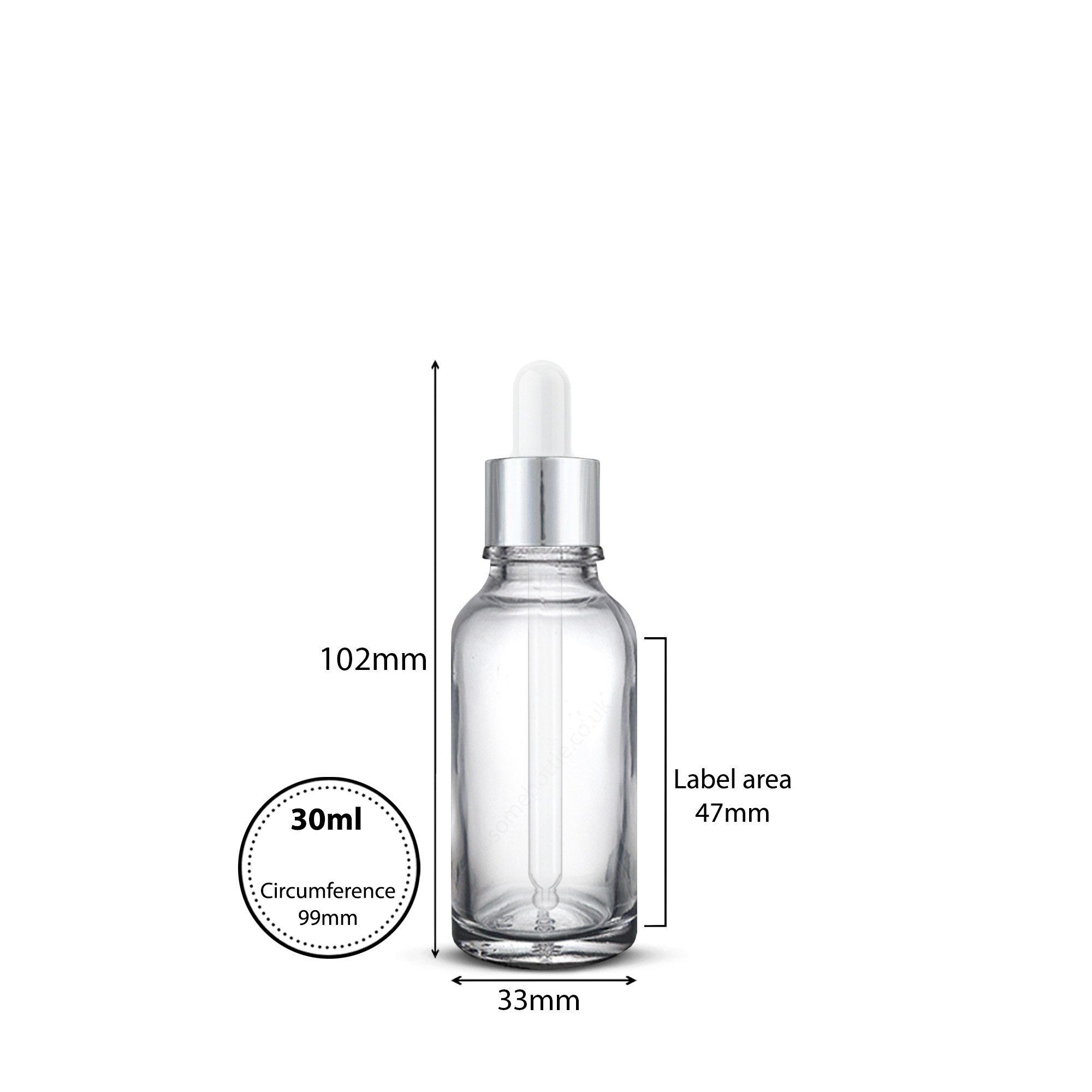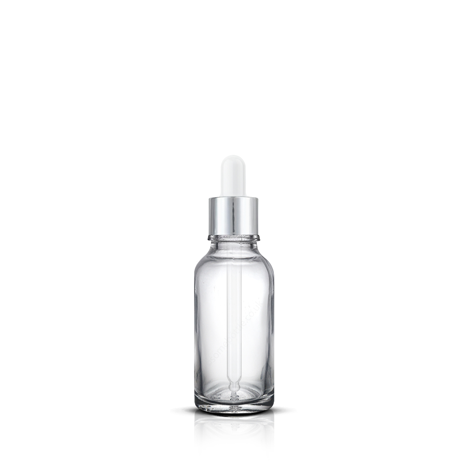 30ml Clear Glass Dropper Bottle with Silver Aluminium Glass Pipette Ball Tip, 18mm Neck (DIN18 – GL18)