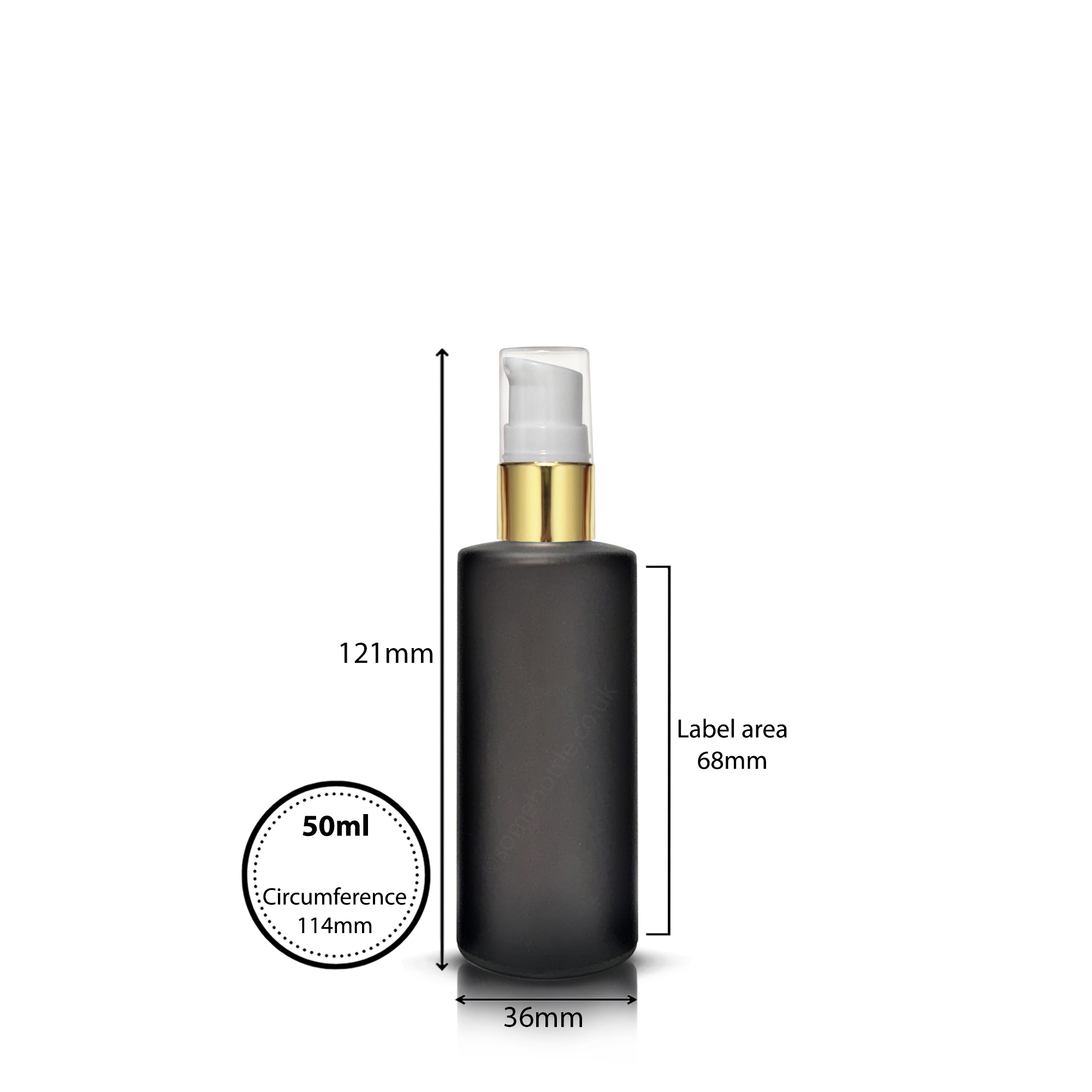 50ml Matte Black Frosted Cylinder Glass Skincare/Serum Bottle With Gold Lotion/Treatment Pump and Clear Cap.