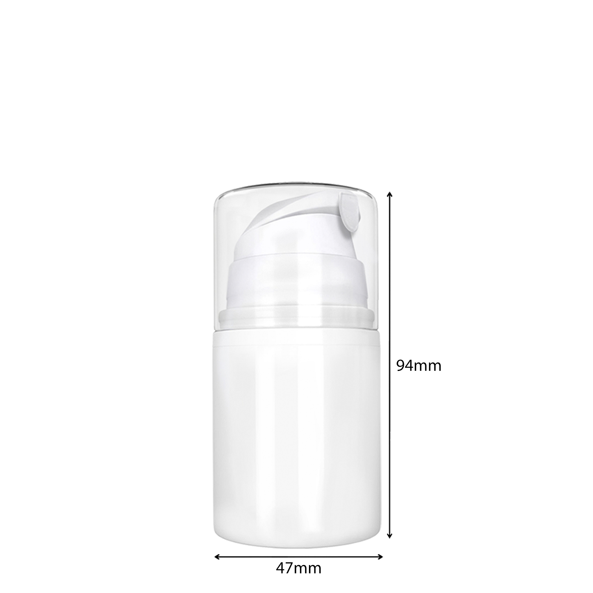 50ml plastic airless bottle with pearl white pump and clear over-cap for lotion, creams, skincare. stylish bottle that offers great full protection to your product.